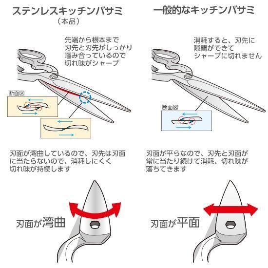 一般的なキッチンバサミは刃面が平らなので、刃先と刃面が常に当たり続けるので消耗し、切れ味が落ちてきます。