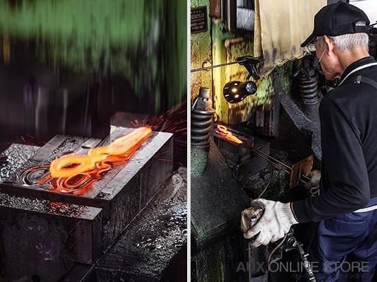 1,200度まで熱せられたステンレス素材を1トンものエアハンマーで打ち付けることで、不純物が抜け強靭な素材に。